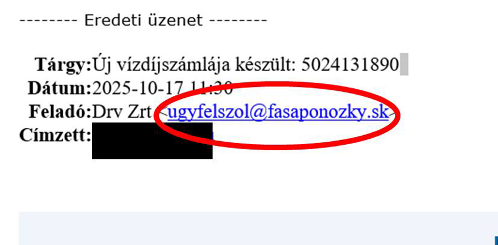 A Duna Menti Regionális Vízmű Zrt. (DMRV Zrt.) a közösségi oldalán hívta fel ügyfelei figyelmét arra, hogy az utóbbi napokban ismét megjelentek a társaság nevével visszaélő csalók. Több fogyasztó jelezte, hogy olyan gyanús e-mailt kaptak, amelyben a vízdíj mielőbbi befizetésére szólítják fel őket. A szolgáltató közleménye szerint ezek az üzenetek nem a DRV Zrt.-től származnak, amit az is bizonyít, hogy a levelek feladója nem a cég hivatalos e-mail címét használja.