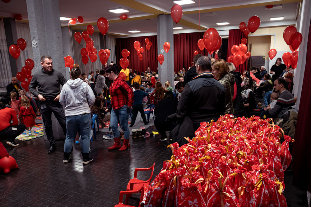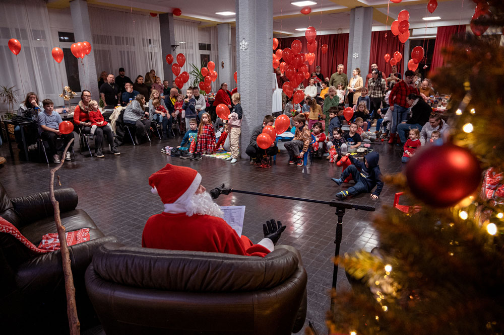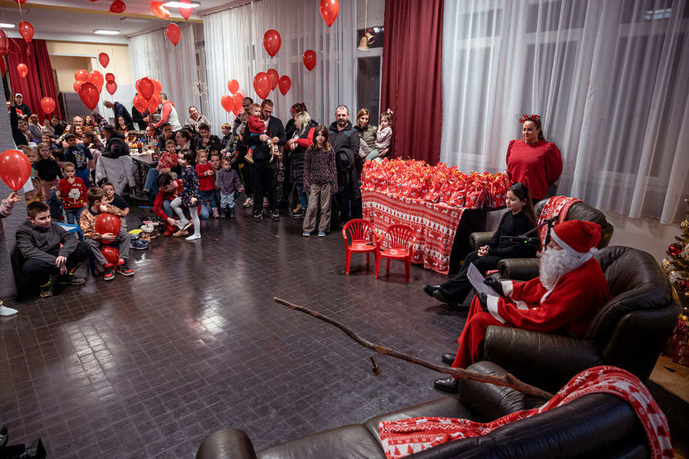 A gyerekek örömujjongása betöltötte a csarnokot, amikor végre megérkezett a Mikulás. A nagyszakállú hosszú listával érkezett: felolvasta a sok új gyerek nevét, és mindenki személyesen vehette át ajándékcsomagját.